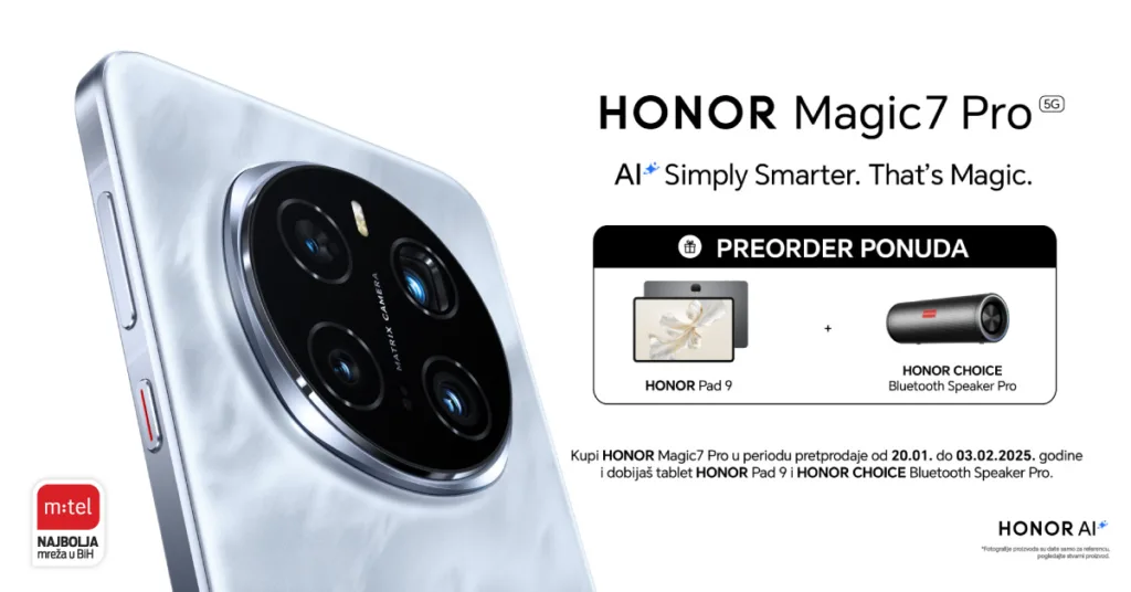Rezervišite novi HONOR Magic7 Pro i na poklon dobijate HONOR Pad 9 i HONOR Choice Bluetooth Speaker Pro ili odaberite HONOR Magic7 Lite i na poklon dobijate HONOR Choice Headphone.